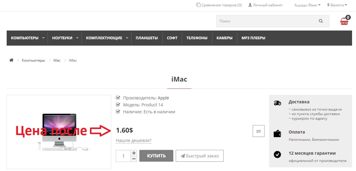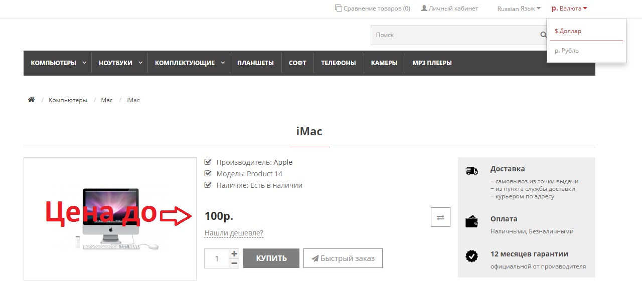 Теперь добавленная валюта доступна клиенту для выбора при покупке товара. Цена автоматически конвертируется, после переключения валюты.