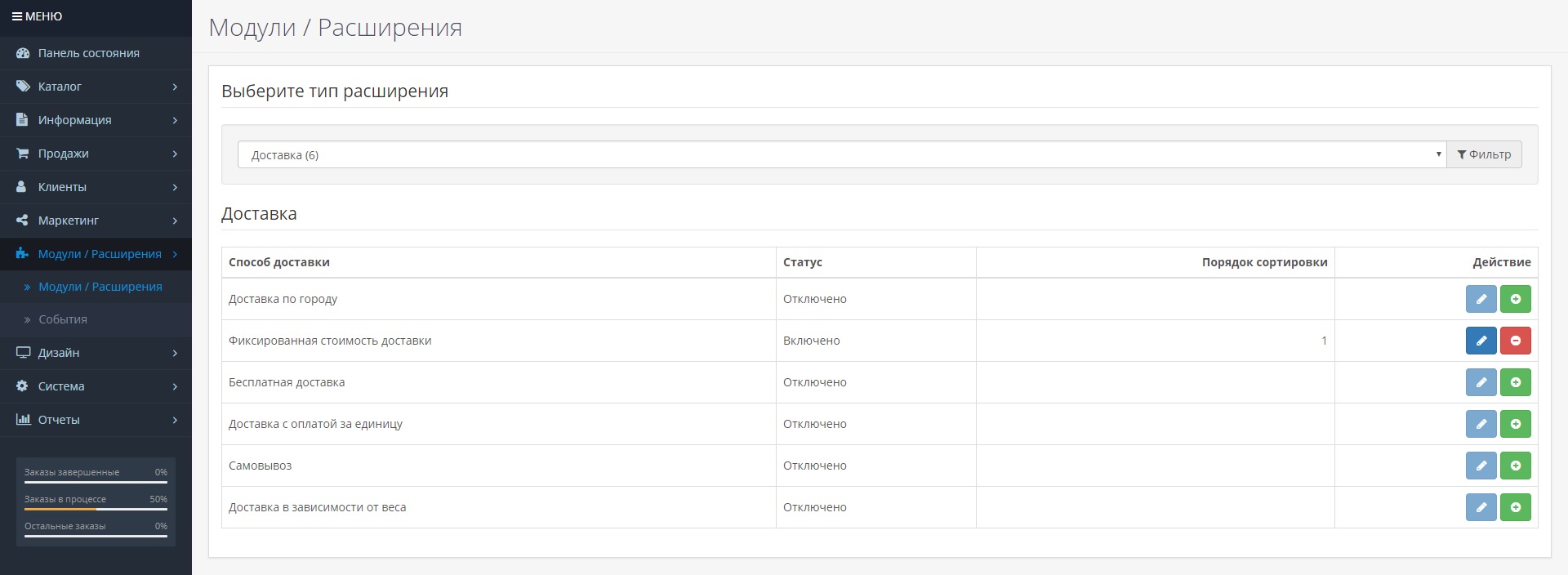 Как и с оплатой, нужно зайти в раздел «Модули / Расширения» — «Модули / Расширения», тип расширения «Доставка».