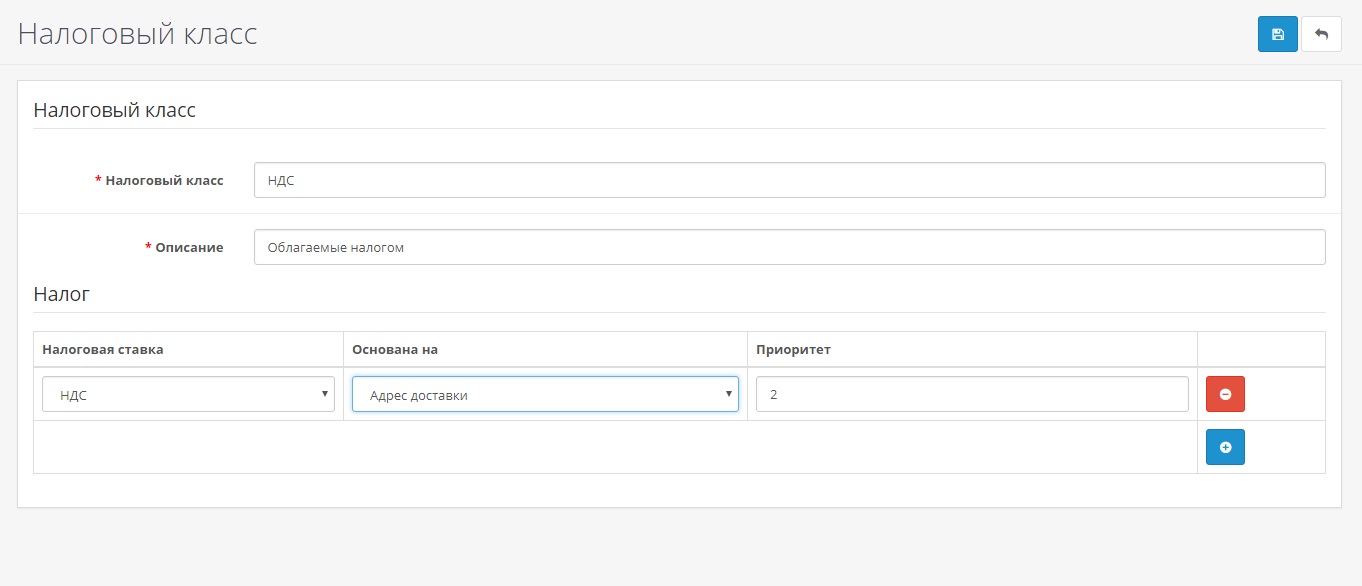 Пункт в меню: Система → Локализация → Налоги → Налоговый класс → «Добавить»: