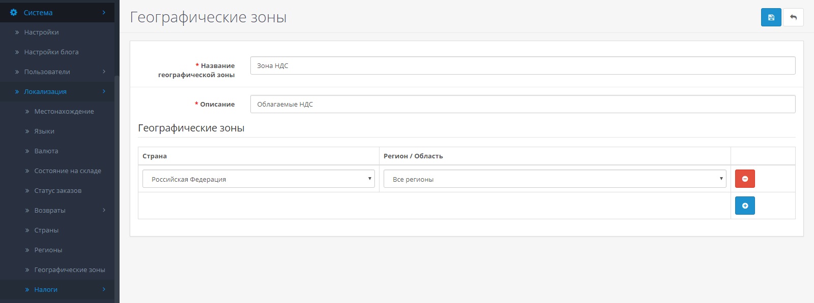 Географическая зона создана. Теперь необходимо добавить налоговую ставку.