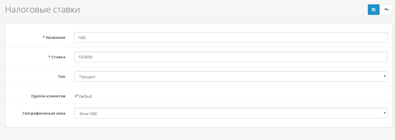 Пункт в меню: Система → Локализация → Налоги → Налоговые ставки → «Добавить»: