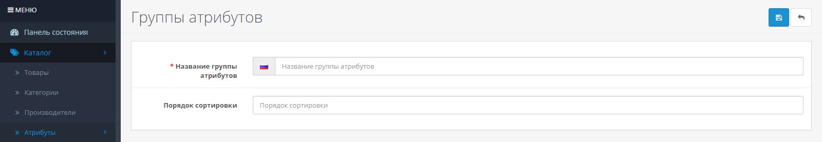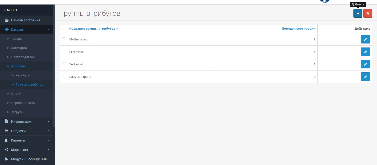 Для создания группы атрибутов необходимо из административной панели Opencart перейти в раздел «Каталог» — «Атрибуты» — «Группы атрибутов».