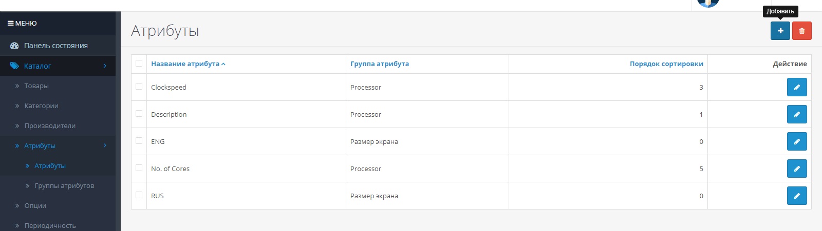 Для создания нового атрибута нажмите на кнопку «Добавить»:
